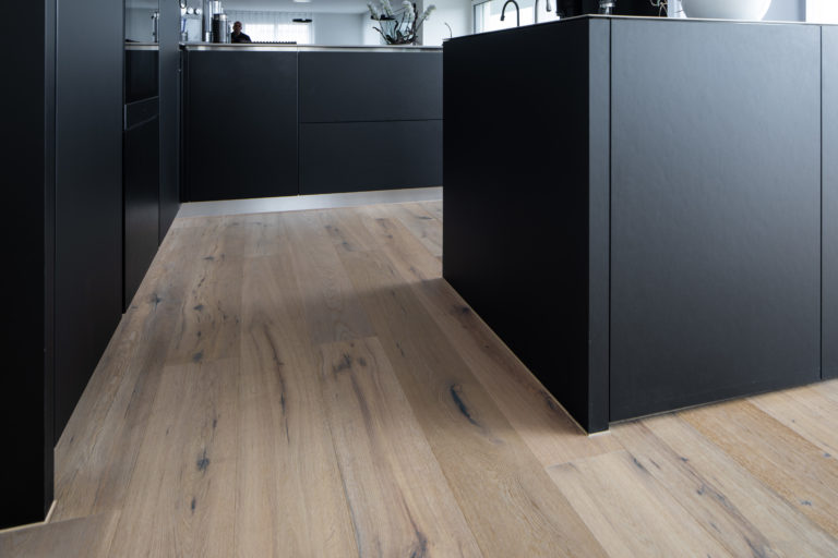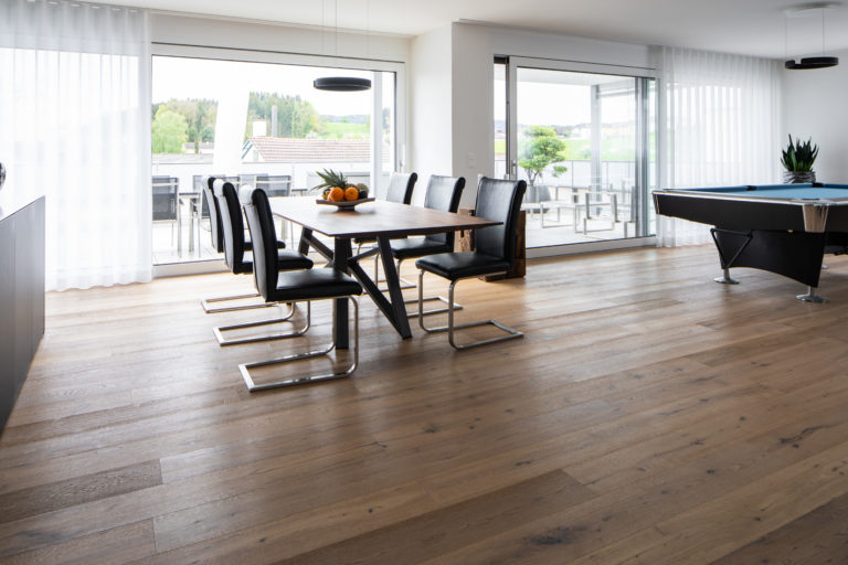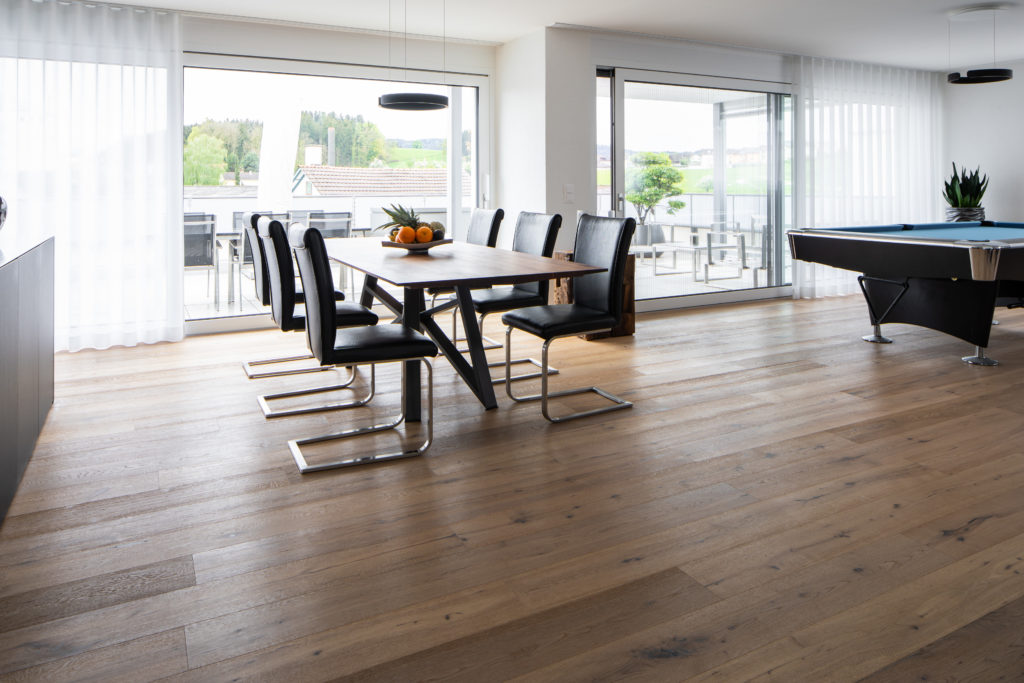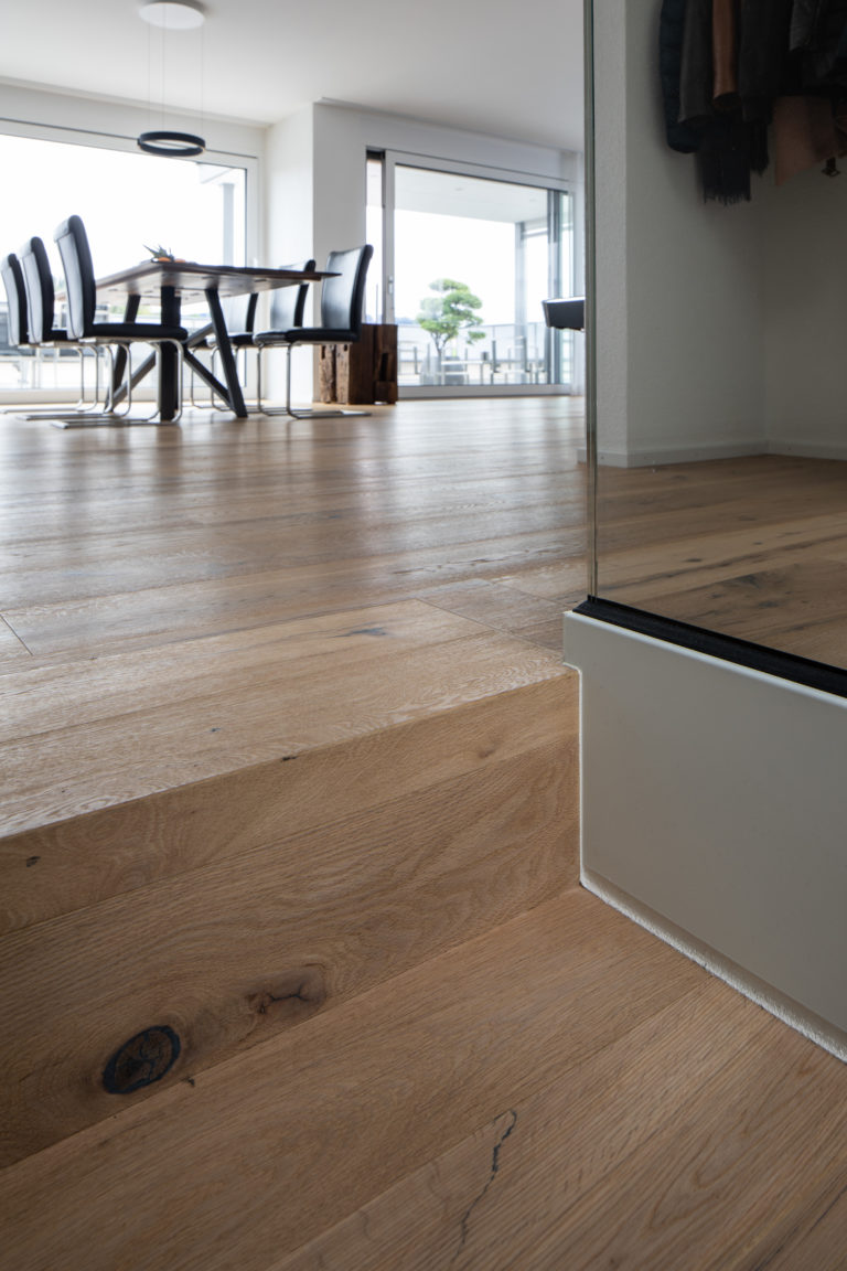 In den neu gebauten Eigentumswohnungen in Lömmenschwil wählte die Bauherrin, die WIM Immobilien AG, einen rustikalen Parkett aus, und zwar die Landhausdiele Home Wood Celerina. Dieses Eichenholz ist weiss geölt und lässt sich sehr gut mit modernem Mobiliar kombinieren. Es bietet einen angenehmen Kontrast und erzeugt eine leichte Atmosphäre in den Wohnräumen. Das rustikale Eichenholz ist zudem strapazierfähig und pflegeleicht.