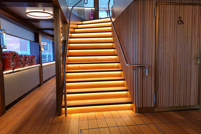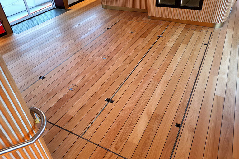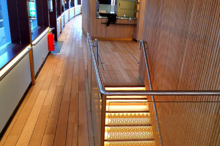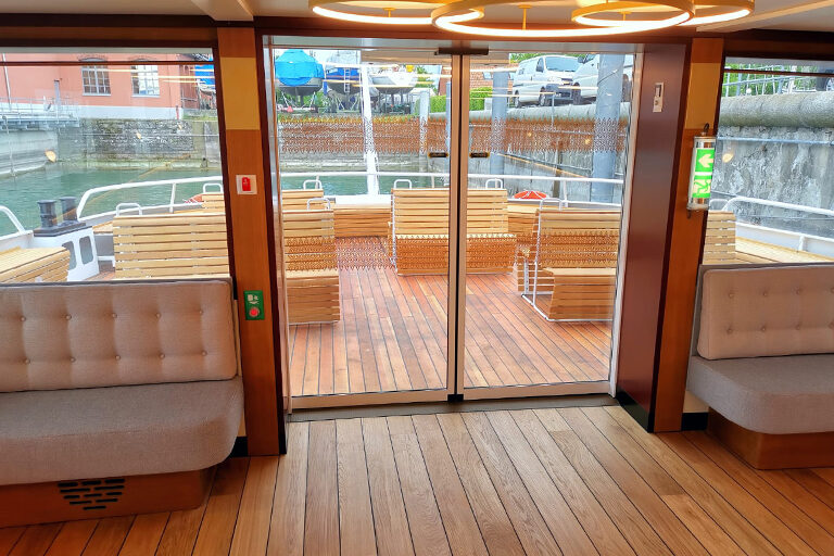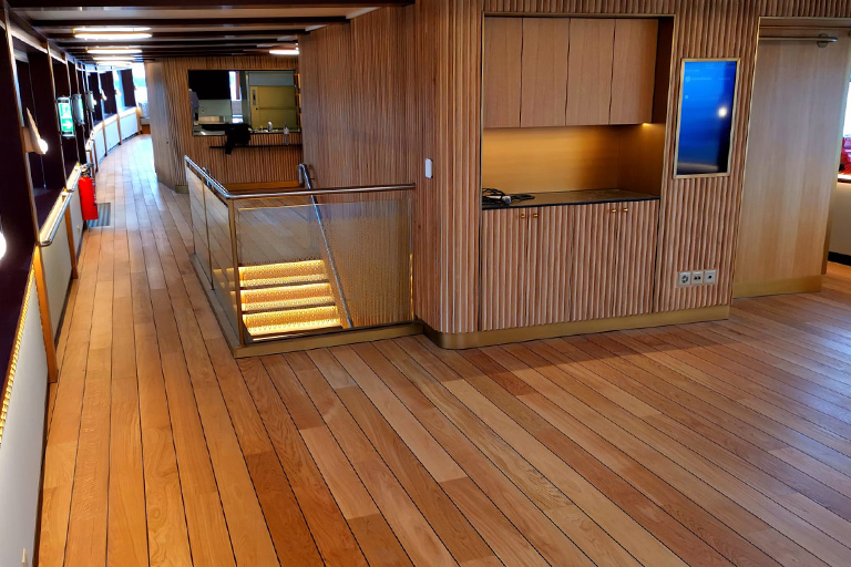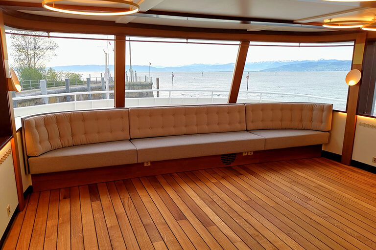 Auf dem Grunddeck wurde ein komplett neuer Parkettboden in Eiche mit Gummiprofilen verlegt und geölt. Eine besondere Herausforderung waren die Gewichtsberechnungen des Parketts inkl. Untergrundmatte und Kleber gewesen. Denn das Schiff durfte nicht schwerer werden, als es zuvor war. Zudem ist der Schiffsboden längs wie quer bombiert, also leicht gewölbt. Diese Wölbungen mussten beim verlegen des Parketts berücksichtigt werden. Im Oberdeck wurde der bestehende Boden abgeschliffen, repariert und schliesslich ebenfalls neu eingeölt. Neben den exakten Ausführungen der Verlegearbeiten war die Zeit eine grosse Herausforderung, da der Zeitplan minutiös eingehalten werden musste. Dies gelang uns dank exakter Planung und einer guten Teamarbeit.