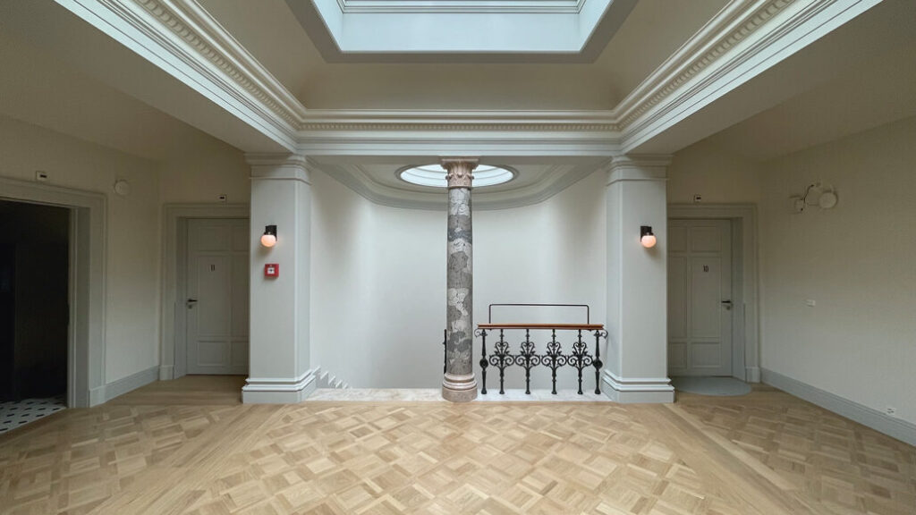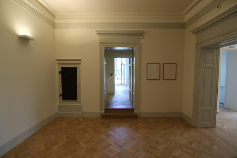Tafelboden zu verlegen, ist eine Handwerkskunst. Besonders herausfordernd, wenn der alte und der neue Boden optisch eins sein müssen. Letzteres galt auch für die Fischgrat- und Schiffsböden, die ebenfalls in der Villa anzutreffen sind. Zum Teil waren die Böden schräg oder wiesen verschiedene Höhen auf. Zuffelato & Wirrer nahm diese Böden raus, glich sie aus, verklebte sie und verlegte anschliessend das Parkett neu darauf.