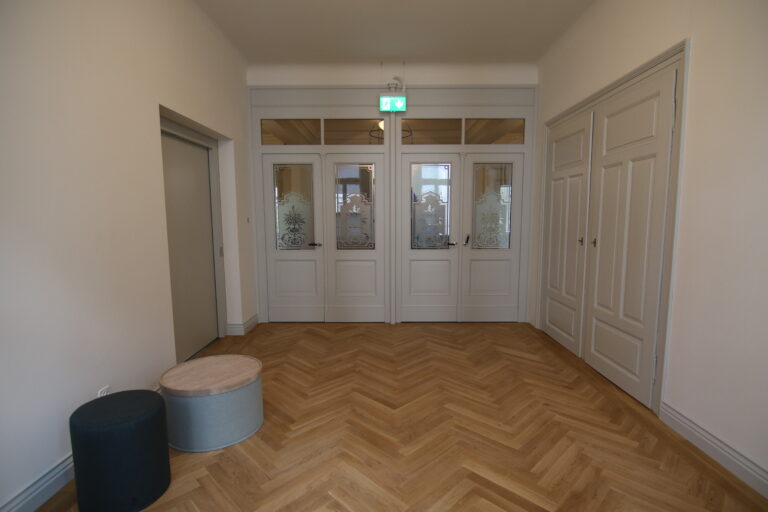Im Rahmen der Umbauarbeiten der geschichtsträchtigen Villa Jacob in St. Gallen zu einem Sterbehospiz renovierte und verlegte die Zuffelato & Wirrer historische Parkettböden. In der knapp 150-jährigen Villa wurden rund 100 Quadratmeter Winkelfriestafeln in Eiche und Nussbaum verlegt. Weitere 150 Quadratmeter wurden geschliffen und versiegelt. Dazu kamen 250 Quadratmeter neu verlegter Fischgratparkettboden in Eiche mit Wandfries und 250 Quadratmeter Schiffsboden in Eiche.